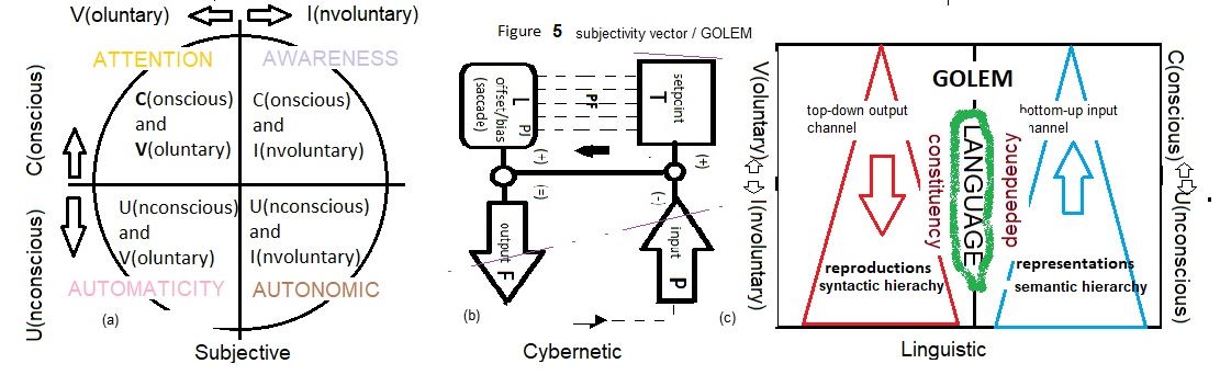 While the TDE diagram (figure 4) explains external aspects of human language via its INTERsubjectivity at TDE level 3, it does not explain its internal aspects, called i-language by Chomsky. This problem is corrected in figure 5. Both TDE fractal architecture and GOLEM diagrams are needed to fully understand the mind's subjective and linguistic features.