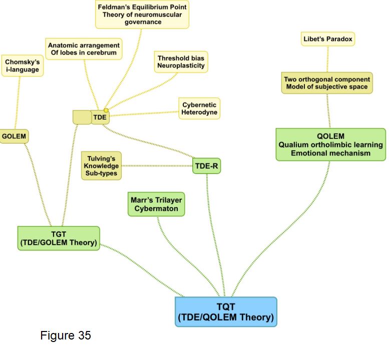 In figure 35 below, the 'discovery pathway' from TDE to TQT is depicted as a graph. Briefly, the first and main discovery was the TDE, found in 2011 after careful examination of the gross (ie macroscopic) neuroanatomy of the human central nervous system (CNS). Strictly speaking, the term TDE* only applies to each cerebral hemisphere. The next step was a speculative one - could the four-lobed TDE pattern be meaningfully applied to the entire CNS? The answer was resolved in the affirmative, by its close agreement with Tulving's knowledge model. This stage of the modelling was called TDE-R, where 'R' stands for 'recursive'. That is, the TDE-R is the global version of the TDE.