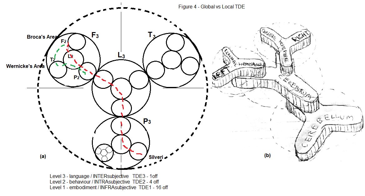 At the behavioural level TDE2, there are two cerebral TDE patterns, each one exerting contralateral (opposite sided) governance** over its subordinate cerebellar image, which in turn exerts ipsilateral (same sided) somatic governance. This is the level (TDE2) at which 3D spatiotemporal functions apply. At the highest level (TDE3), the level of the self, the 'space' in which each subject's agency is embedded and applied is a socio-linguistic and not a spatiotemporal one. Note that at the topmost level (TDE3), neural representations are inherently subject-agnostic. When we construct internal data structures of our own (self-generated) speech, they are identical to those we construct for speech we hear (other-generated). TDE3 is an INTERsubjective layer.