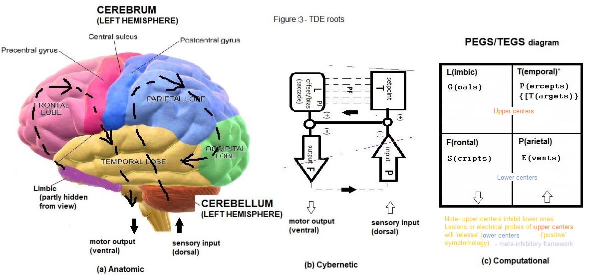 You may have noted the rather unusual choice of letters (F,L,T,P) denoting the key parts of the heterodyne. This choice is hardly accidental. These labels reflect the four main types of lobe in the cerebrum, F(rontal), L(imbic), T(emporal) and P(arietal) - see figure 3(a). Their combination, called the TDE, functions as a hybrid (feedforward-feedback) 'motion control' governor. The TDE is the fractal pattern that acts as a generatrix (kernel function) for all biological intelligence. The TDE is the simplest ('Occam's Razor') mechanism that explains all of the major observations (interpolation) and then some (extrapolation beyond the data set - the gold standard in model making). In this page we describe how the TDE works. TDE theory integrates the most recent advances in research, including embodied, situated and embedded approaches to cognitive computing. TDE theory also makes several new claims, facts which can (and will) be verified.