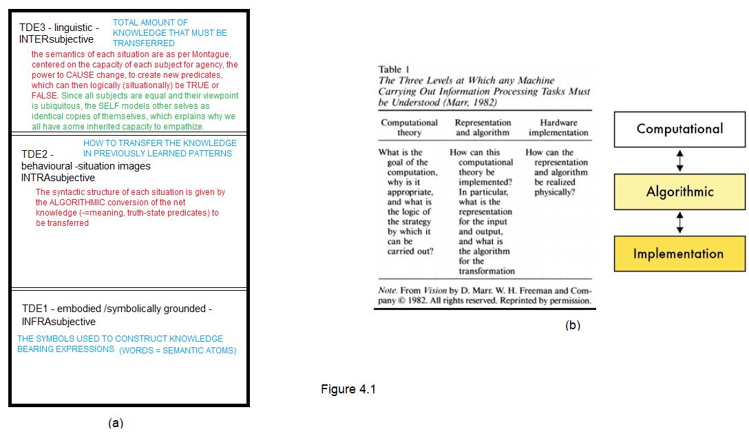 The reader should keep in mind that the truest functional view of the TDE at each of its three levels is the cybernetic view shown in figure 3(b). If the reader feels they are 'drowning' in detail, they should always return to figure 3(c). However, the views depicted in figures 3(a) and (c) and figures 4(a) and (b) are also necessary in certain explanatory contexts. Consider the description given of the uppermost level TDE3. This is the level of language (actually, narrative) and hence is the level of self. Note that it is an INTERsubjective level- it treats all subjects (ie selves) as equivalent. This may explain, in a very concrete and structural manner, why the schizophrenic's brain often 'replays' non-self voices in echoic memory, eg they 'hear voices', often instructing the subject to act destructively, eg self-harm. Note that this can only logically be the case if thought is indeed a form of internalised language, as was once believed, but is now theoretically out of favor.