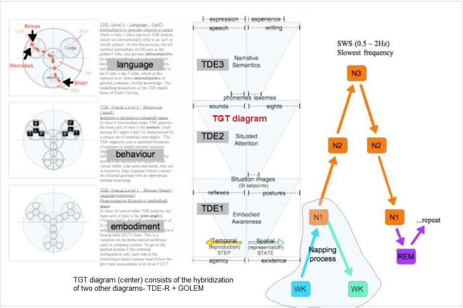 In the figure below, the three levels of the TDE are shown, take particular note of the boundary between TDE1 and TDE2. The diagram is a hybrid of the GOLEM hierarchical memory diagram, and the TDE-R fractal architecture diagram, therefore it is called the TGT diagram, where TGT is an acronym for TDE/ GOLEM Theory. Like the GOLEM, the TGT has two columns, the left-hand column represents the motor/output/conceptual channel, while the right-hand column represents the sensor/input/perceptual channel. But like the TDE-R diagram, the TGT has three rows, corresponding to the TDE's three fractal levels.