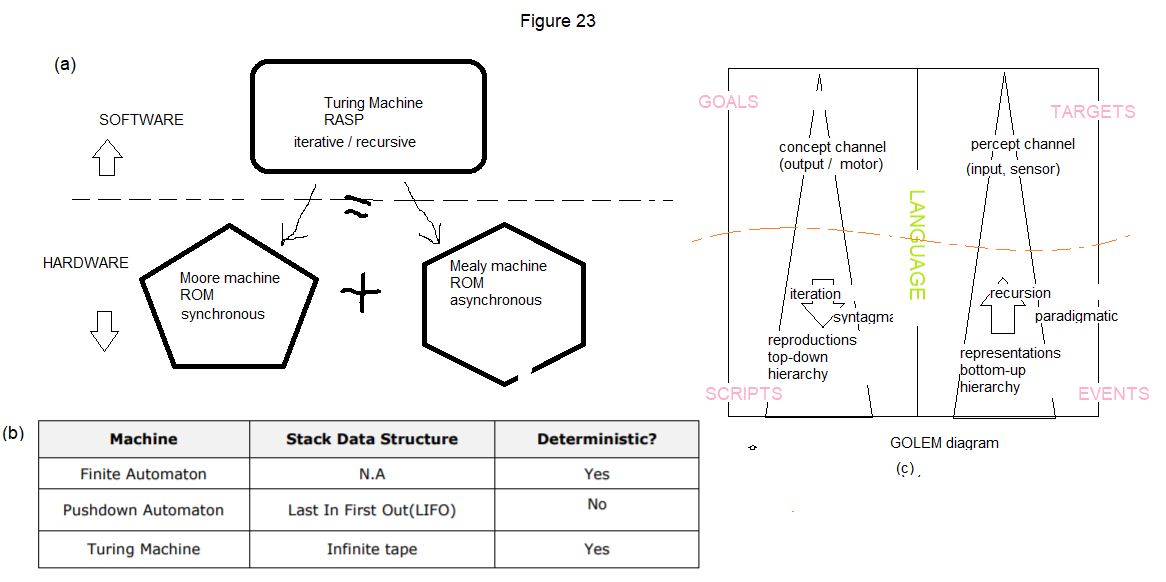 It is debatable whether Turing invented** 'software', that name we use for turning hardware-like mechanisms into data patterns that can be processed just like any other input data source. There is no doubt, however, that he was fully aware of the kinds of RASP (random access sequential processing) techniques which we have come to know as 'algorithms'. Figure 1 depicts how the 'unlimited' Turing Machine (the most universal type of FSA, a RASP) at a higher level of abstraction can be emulated by a combination of Moore machine (a synchronous, 'choice'*** c-machine, externally governed ROM) and Mealy machine (asynchronous, 'automatic' a-machine, internally governed ROM) at a lower, more concrete level. Figure 23(a) presents this idea, depicting what is really a complete theoretical overview and definition of all modern computers.